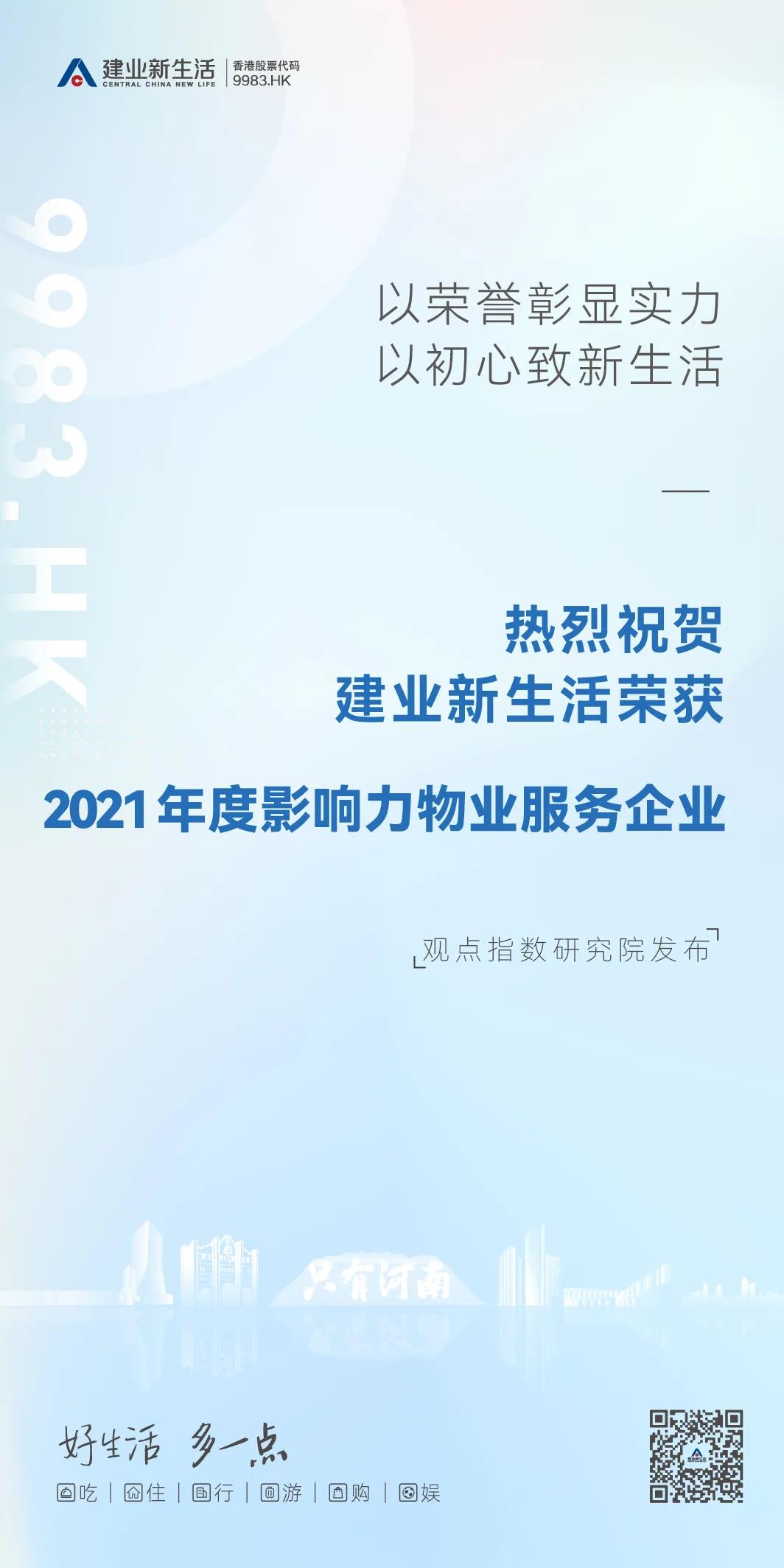 河南建業新生活服務有限公司(以下簡稱“建業新生活”)秉承“一切以客戶為中心”的企業理念,以“根植中原 造福百姓”為核心價值觀,致力于打造新型生活方式服務平臺。2020年5月15日,建業新生活(股票代碼:9983.HK)在香港聯合交易所主板成功掛牌上市。圍繞基礎服務、生活服務等業務,公司已形成物業基礎服務、管家幸福服務、“建業+”生活服務、物業云智慧服務等四大服務體系,根據業主在人生不同階段的個性化需求提供全生命周期服務,并依托“建業+”幸福生態系統及會員權益平臺“建業+”APP,為業主提供地域、時間、功能無盲點的服務。 建業新生活是中國物業管理協會名譽副會長單位,旗下建業物業是河南省物業管理協會副會長單位、鄭州市物業管理協會副會長單位。2021年、2022年,建業新生活蟬聯中國物業服務百強企業11強,并榮獲“中國物業服務上市公司綜合實力TOP10”“物業服務多元化運營優秀企業”等多項榮譽,持續引領中原人居服務新高度。